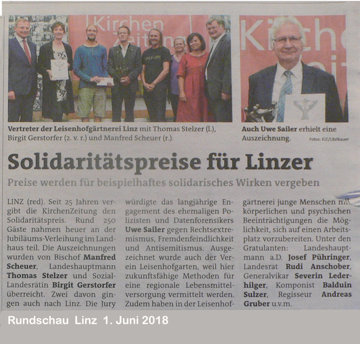Linz: Seit 25 Jahren vergibt die KirchenZeitung den Solidaritätspreis. Rund 250 Gäste nahmen heuer an der Jubiläums-Verleihung im Landhaus teil. Die Auszeichnungen wurden von Bischof Scheuer, Landeshauptmann Thomas Stelzer und Soziallandesrätin Birgit Gerstorfer überreicht. Zwei davon gingen auch nach Linz. Die Jury würdigte das langjährige Engegament des ehemaligen Polizisten und Datenforensikers Uwe Sailer gegen Rechtsextremismus, Fremdenfeindlichkeit und Antisemitismus.