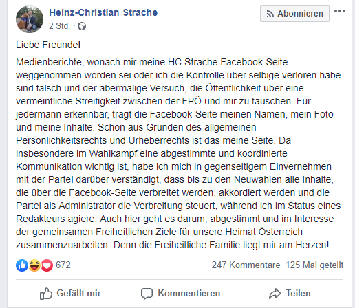 Heinz-Christian Strache betrachtet seine offizielle Facebook-Seite nach wie vor als seine eigene: „Medienberichte, wonach mir meine HC Strache Facebook-Seite weggenommen worden sei oder ich die Kontrolle über selbige verloren habe sind falsch“, postete er auf seinem persönlichen Facebook-Auftritt. Bis zur Wahl werden aber alle Inhalte mit der Partei „akkordiert“, erklärte er.