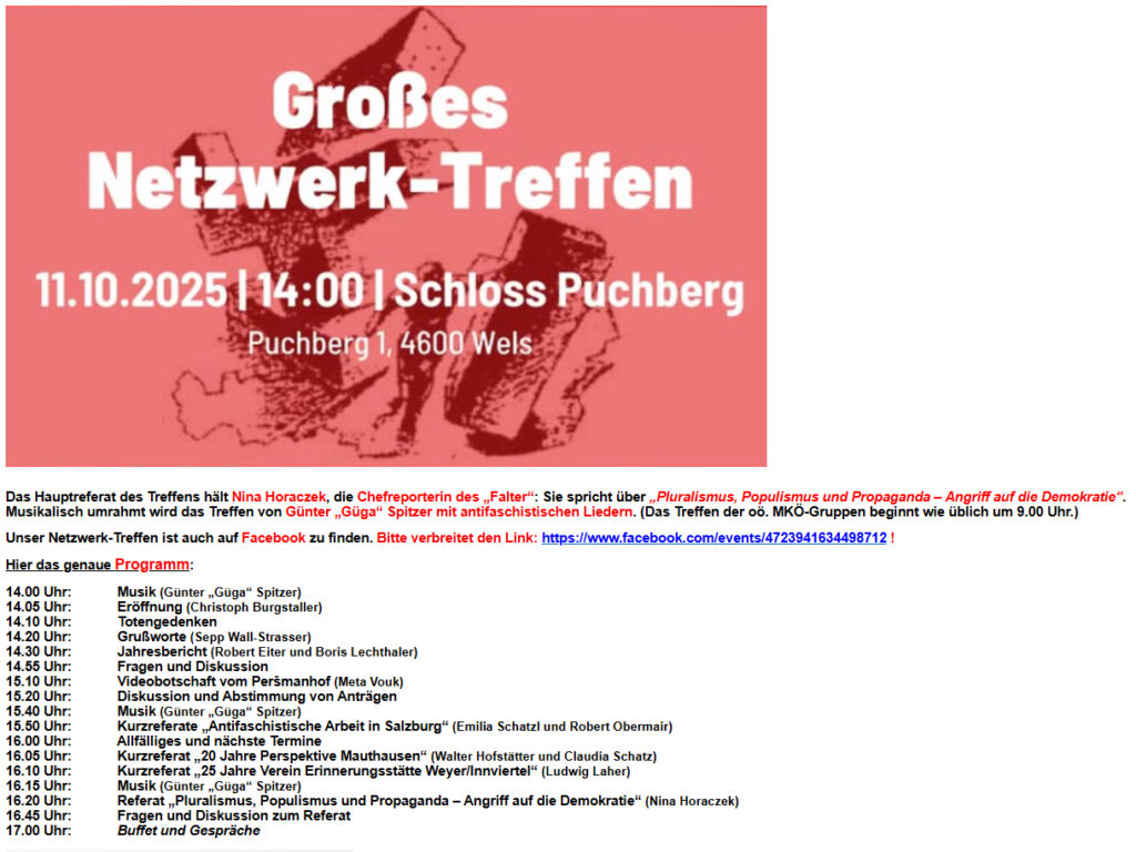 |Am 11. Oktober 2025 findet wieder das große Netzwerk-Treffen der Antifa in Wels, Schloss Puchberg statt. Es sind alle, die sich gegen Rechtsextremismus, Faschismus und Rassismus engagieren, recht herzlich eingeladen. Die Teilnahme ist kostenlos.